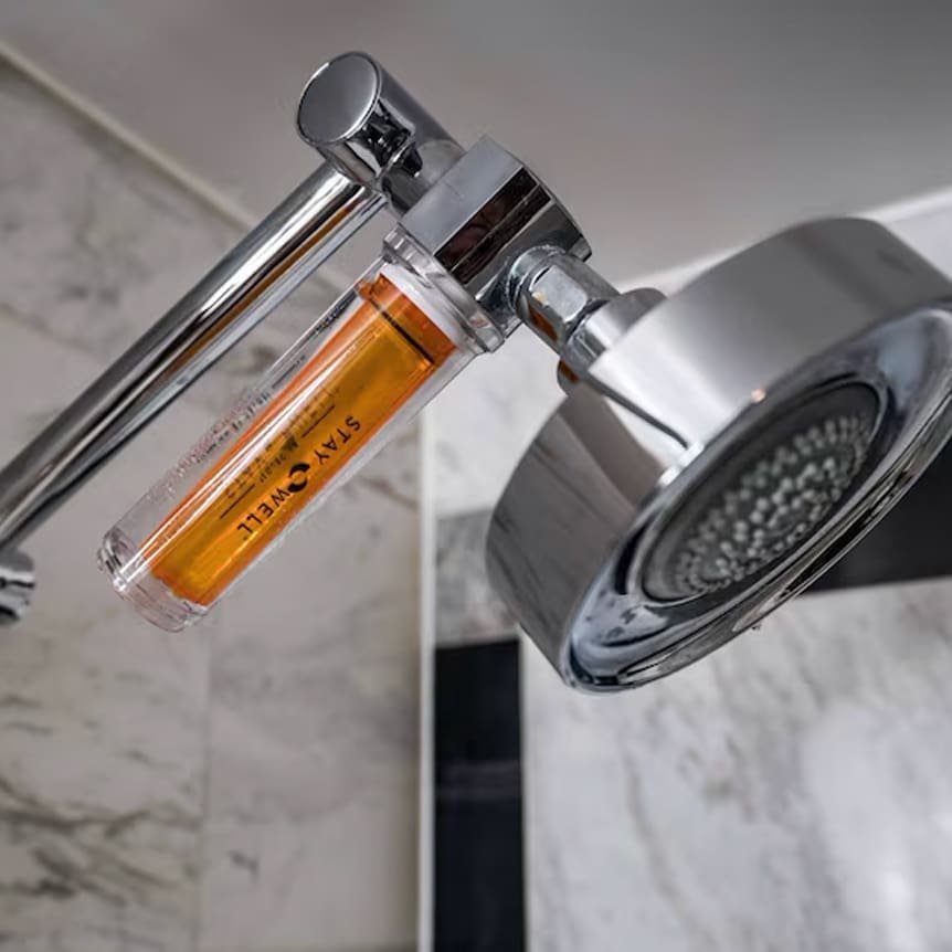 Our Staywell Vitamin C Shower Infusers transform ordinary showers into a revitalizing self-care ritual by neutralizing chlorine and improving skin and hair quality.
